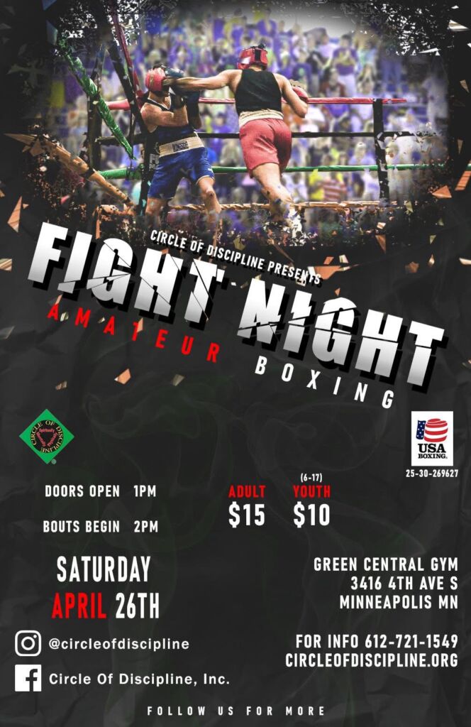 Also today in Minneapolis, Circle of Discipline, Inc. presents “Fight Night” at Green Central Gym, 3416 4th Ave S, Minneapolis, MN. Doors open at 1 PM with bouts set to begin at 2 PM. Tickets are $15 for adults, $10 for youth ages 6–17, and kids 5 and under are free. For more information, visit circleofdiscipline.org or call 612-721-1549. COD events are well-known for showcasing high-level amateur talent in a great community atmosphere.