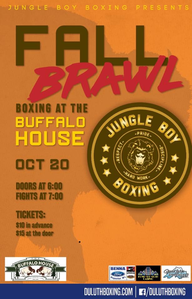 Jungle Boy Boxing Gym’s show called “Fall Brawl” is set to happen at the Buffalo House in Duluth, MN. Promoter Zach Walters says that it’s a smaller show geared towards getting everyone the best developmental matches. There will be 14 bouts with the doors opening at 6 PM and the action beginning at 7 PM. To view more info on the event CLICK HERE.