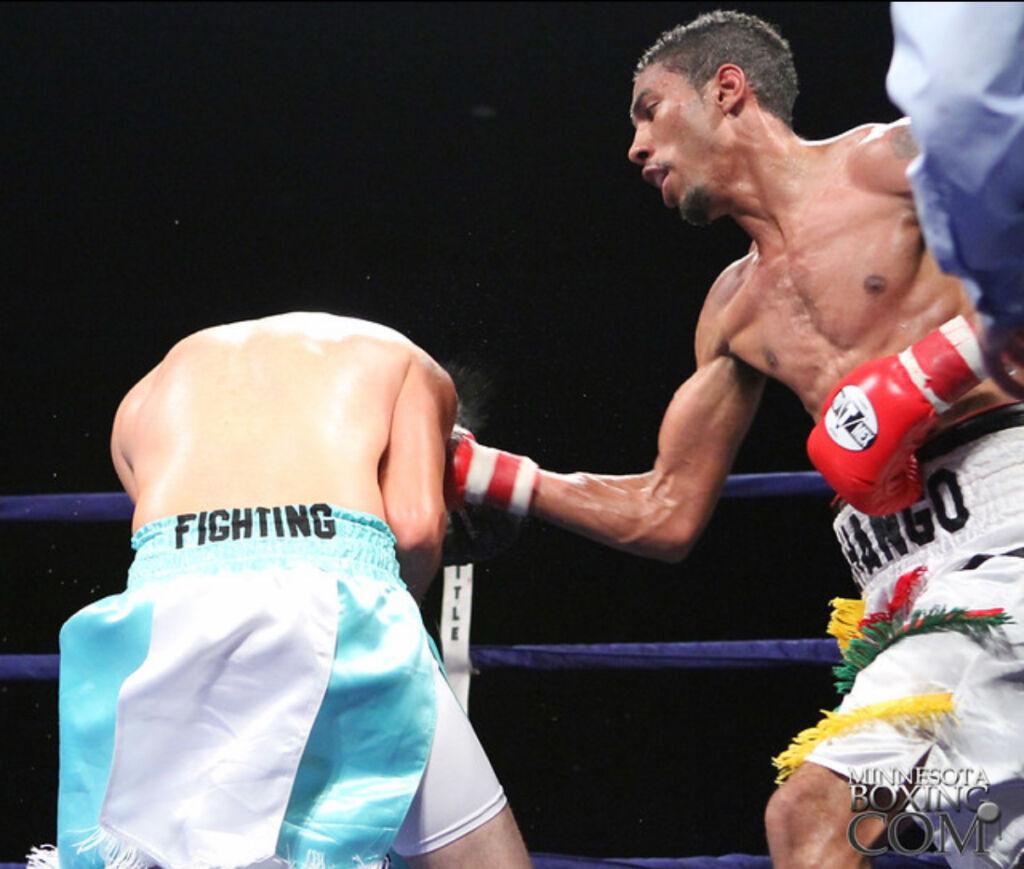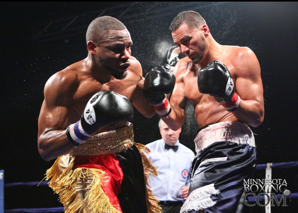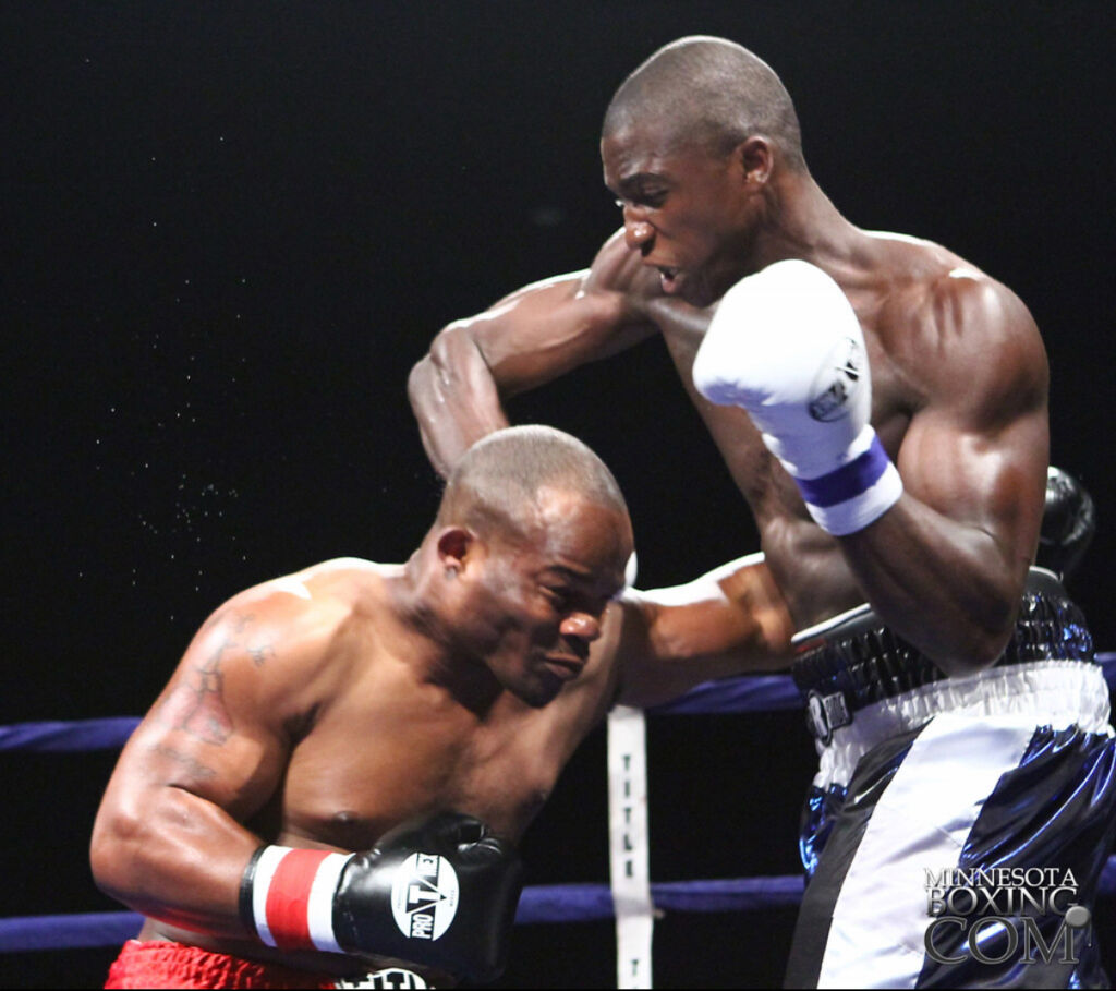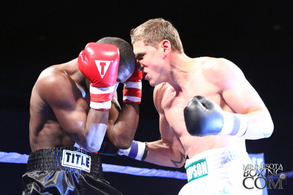 “Sir” Cerresso Fort (13-0-1, 10 KO’s) won a hard fought majority decision over Dave “The Prodigy” Peterson (13-1, 8 KO’s) Saturday night at the Black Bear Casino in Carlton, MN. The action was presented by Jungle Boy Boxing. The good action in the opening round exploded into an all out war over the next seven rounds which were marked by both boxers giving it everything they had. The blood started flying early and often leaving the fighters cut and swollen and even a few ringsiders spotted in red. Peterson (151.5 lbs at weigh-ins) surprised everybody by coming forward early and controlling the flow inside the ring, which looked more like a kids play pen because of its unusually small size. But it was obvious by the polished boxing moves being display that these weren’t children playing. Peterson spun and circled his way to the inside where he got the better of things to start. Fort (154 lbs) chose to box, and counter with head shots while moving backwards. For now, Fort was letting the aggressive style we have come to expect lay dormant with Floyd Mayweather Sr. giving instructions from his corner.