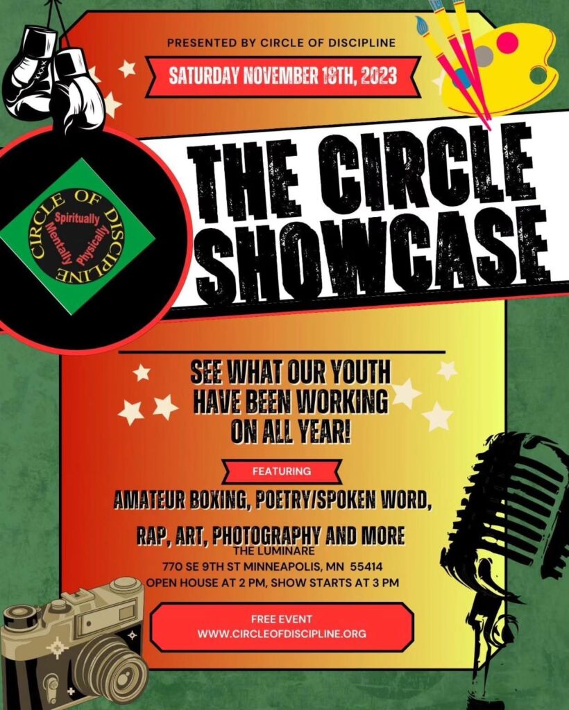 The Circle of Discipline hosts amateur boxing and more at the “Circle Showcase” this Saturday, November 18, 2023 at the Luminare in Minneapolis. The event will highlight the talent in the Circle’s youth programs which include boxing, poetry/spoken word, rap, art, photography and more. The doors open at 2 PM with the show set to start at 3 PM. This is a free event however donations are welcome to help support the COD youth programs here https://www.givemn.org/donate/Circle-Of-Discipline.
