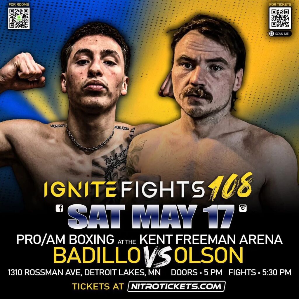 On May 17, 2025, the Kent Freeman Arena in Detroit Lakes, Minnesota, will host IGNITE Fights 108, a Pro-Am boxing event that promises an exciting lineup of bouts. Among the anticipated professional bouts is the pro boxing debut of two local fighters: Dominic St. Claire-Badillo residing in Moorehead, MN and Nicholas Olson from Fertile, MN.