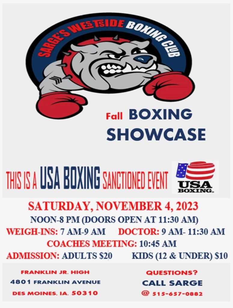 Sir Boxing Gym boxers Andrew Doeksen, Ian Chamblin, Andy Fretes, Devin Carter will be in Iowa with coaches Cerresso Fort and John Johnson. The show is hosted by Sarges Westside Boxing and located at Franklin Junior High School in Des Moines, Iowa with the action beginning at Noon.